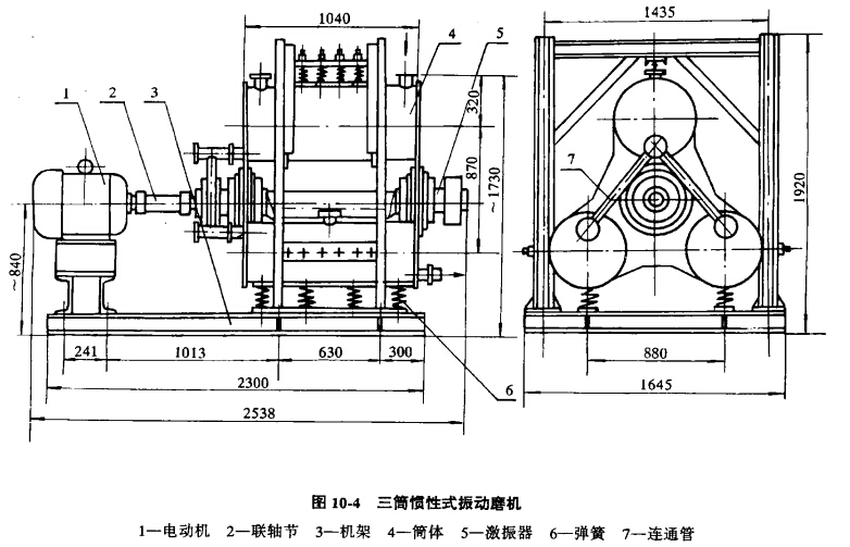 三筒慣性式振動(dòng)磨機(jī)的構(gòu)造如圖10-4所示。它由電機(jī)1、聯(lián)軸節(jié)2、機(jī)架3、筒體4、激振器5、彈簧6相連通管7等部分組成。振動(dòng)磨機(jī)的筒體由三個(gè)圓筒和兩塊側(cè)板構(gòu)成,通過(guò)兩側(cè)板將較大的上圓筒φ400xl040和較小的兩個(gè)下圓筒φ320xl040串聯(lián)在一起,而兩個(gè)下圓筒彼此互成并聯(lián),各圓筒內(nèi)壁上均鈕有襯板,以防筒壁磨損。激振器主要由偏心軸、可調(diào)式偏心塊、鑄鋼軸承座、雙列調(diào)心滾子軸承和迷宮式密封環(huán)等組成。電機(jī)1通過(guò)彈性聯(lián)軸節(jié)2帶動(dòng)激振器5的偏心軸及安裝在軸兩側(cè)的偏心塊旋轉(zhuǎn),產(chǎn)生離心力,從而使坐落在彈簧上的筒體產(chǎn)生高頻小幅振動(dòng)。物料和水不斷地從上圓筒的給料口加入,物料在筒內(nèi)粉磨介質(zhì)的頻繁沖擊和研磨作用下被磨細(xì),完成一段粉磨,而后經(jīng)過(guò)排料連通管分別流入下部?jī)蓚€(gè)小圓筒內(nèi)進(jìn)行第二段粉磨,粉磨好的合格產(chǎn)品從小圓筒的排料口排出。整個(gè)粉磨作業(yè)為連續(xù)作業(yè)。